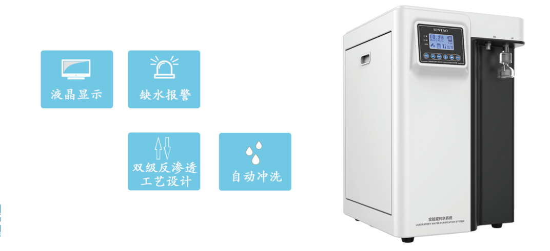 1、仪器一机两用采用双级反渗透工艺,RO反渗透水和UP超纯水(可同时取2种水质)